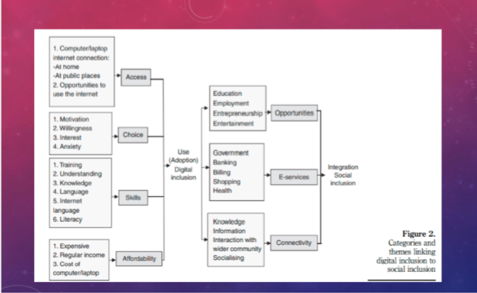 In conclusion, Prof. Yan suggests that improved digital inclusion may have a resultant postitve effect on social inclusion of marginalized communities. He ended his presentation on a high note with optimistic recommendations for digital inclusion using the proposed model below.