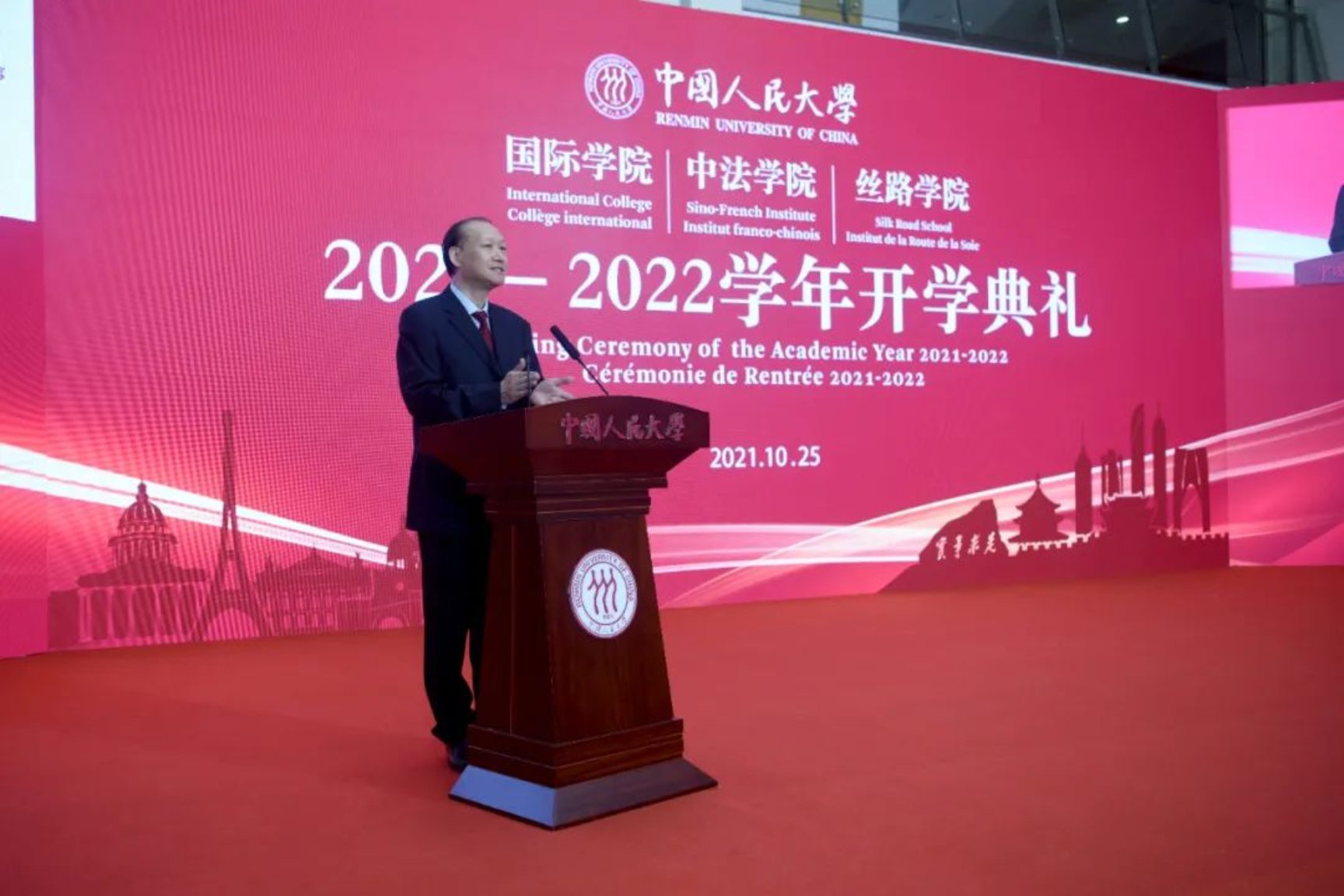 On the morning of October 25, 2021, the opening ceremony of the 2021--2022 academic year of the Silk Road School, Sino-French Institute and International College of Renmin University of China (RUC) was held successfu in Kaitai Building, Suzhou Campus. Full of longing and expectation, the freshmen of grade 2021 gathered in Suzhou Campus of RUC to embark on a new journey of life with a youthful attitude of struggle.